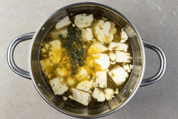 Die Strunkstücke und ca. 3/4 der Blumenkohlröschen in den Topf geben und 800ml heißes Wasser angießen. Das Brühgewürz und die 1/2 des Thymians unterrühren und die Suppe abgedeckt bei mittlerer Hitze ca. 15Min. köcheln lassen.