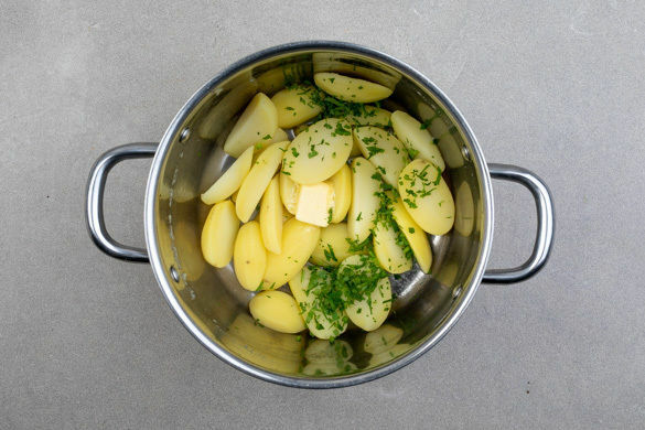 In einem großen Topf ausreichend gesalzenes Wasser für die Kartoffeln zum Kochen bringen. Die Kartoffeln schälen, ggf. halbieren oder vierteln, in das kochende Wasser geben und in 15–20Min. gar kochen. Tipp: Die Kartoffeln sind durch, wenn sie sich bei der Messerprobe leicht vom Messer lösen. In ein Sieb abgießen und abkühlen lassen.