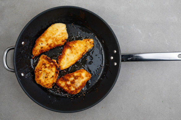 Das Fleisch von beiden Seiten mit je 1 Prise Salz und Pfeffer würzen und der Reihe nach leicht mehlieren, durch das Ei ziehen und zum Schluss in den Panko-Paniermehl wenden. In einer mittelgroßen Pfanne mit 2EL Pflanzenöl bei mittlerer Hitze auf jeder Seite 2–3Min. goldbraun ausbacken.