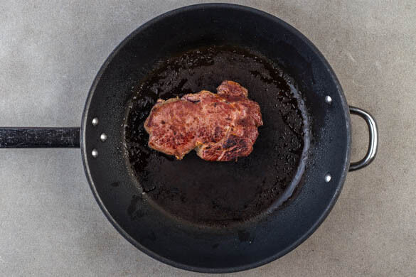 Eine mittelgroße Pfanne bis zum Rauchpunkt erhitzen und 1EL Pflanzenöl hineingeben. Das Fleisch auf jeder Seite 1–2Min. anbraten. Dann herausnehmen, in eine kleine Auflaufform geben und in 5–7Min. im Ofen fertig garen. Für die Sauce die Hitze reduzieren und die Zwiebeln und die ½ des Salbeis oder mehr in der Pfanne mit 1EL Pflanzenöl bei mittlerer Hitze 3–4Min. anschwitzen.