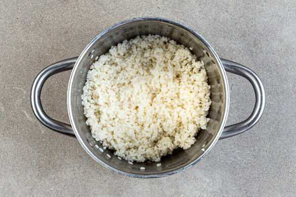 Den Reis in einem Sieb kalt abspülen, bis das Wasser klar bleibt. Den Reis in die 800ml kochendes Wasser geben und abgedeckt bei niedrigster Hitze 18–20Min. kochen, bis das Wasser aufgesogen und der Reis gar ist. Noch ca. 5Min. ohne Hitzezufuhr ziehen lassen.