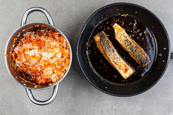 Den Fisch wenden und weitere 3–5Min. braten. Die Würzsauce über den Fisch gießen und ca. 30Sek. einköcheln lassen. Die eingelegten Karotten unter den Reis mengen. Den Fisch auf Teller verteilen, mit der eingedickten Würzsauce beträufeln und mit dem Spinat und dem Reis servieren.