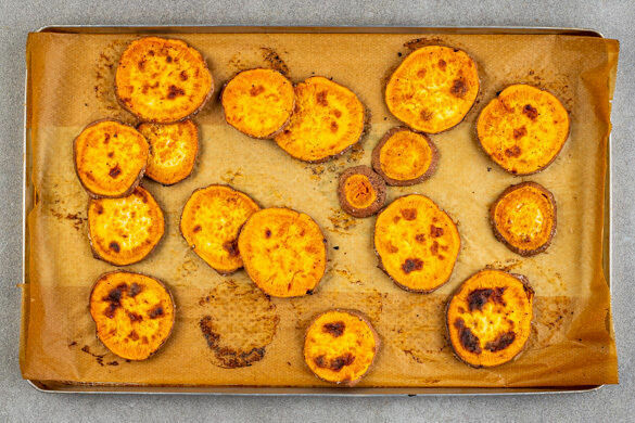 Den Backofen auf 240°C (220°C Umluft) vorheizen. Wenn das Fleisch ca. 15Min. geköchelt hat, die Süßkartoffeln samt Schale in 3–5mm dünne Scheiben schneiden, auf einem mit Backpapier ausgelegten Backblech mit 2EL Pflanzenöl, ½TL Salz und 1 kräftigen Prise Pfeffer vermengen und gleichmäßig verteilen. Im Ofen in ca. 20Min. goldbraun backen, dabei einmal wenden.