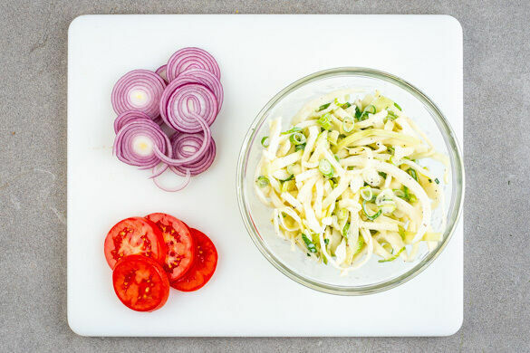 Den Weißkohl halbieren, in feine Streifen schneiden und ca. 30Sek. mit den Händen weich kneten. Die Lauchzwiebeln in Ringe schneiden und mit dem Weißkohl, 4EL Mayonnaise, 2EL Essig und je 1 kräftigen Prise Salz, Pfeffer und Zucker zu einem Coleslaw vermengen. Die übrigen Tomaten in dünne Scheiben schneiden. Die Zwiebel schälen und ebenfalls in dünne Scheiben schneiden.