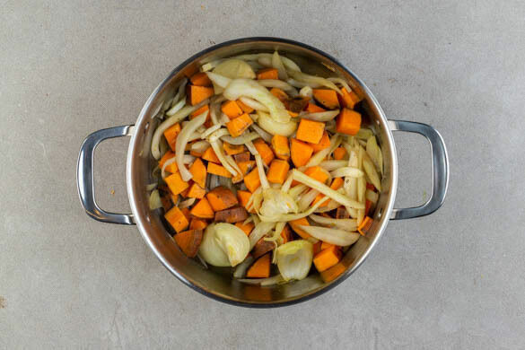 Die harten Stiele des Fenchels entfernen, dabei das Fenchelgrün als Garnitur aufbewahren. Den Fenchel längs halbieren und quer in dünne Streifen schneiden, den harten Strunk ggf. entfernen. Die Süßkartoffeln samt Schale in ca. 2cm große Würfel schneiden. Die Zwiebeln schälen und vierteln.