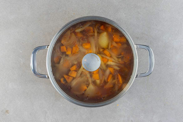 Die Gewürzmischung und die Fenchelsamen in den Topf rühren und ca. 1Min. mitbraten. Dann 1,2L heißes Wasser angießen und aufkochen. Den Eintopf abgedeckt bei mittlerer bis niedriger Hitze 6–10Min. köcheln lassen, bis die Süßkartoffeln gar sind.