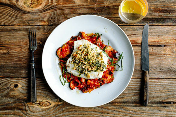 Währenddessen die Gemüsepfanne mit Salz und Pfeffer abschmecken und weitere 5–10Min. ohne Deckel köcheln lassen, bis die Flüssigkeit um etwa die Hälfte reduziert ist. Den Fisch mit dem Gemüse anrichten und mit dem restlichen Basilikum garniert servieren.