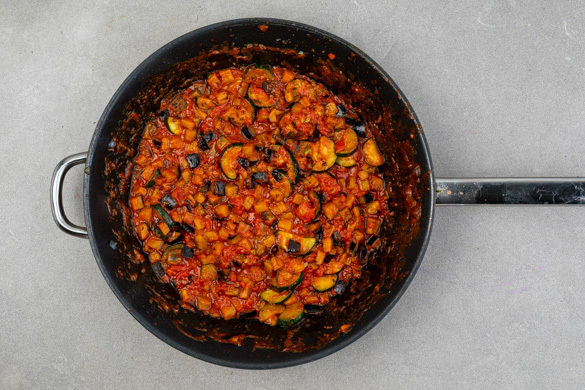 Den Backofen auf 220°C Umluft (240°C Ober-/Unterhitze) vorheizen. Die Aubergine in ca. 1cm kleine Würfel schneiden. Die Zucchini längs halbieren und in dünne Scheiben schneiden. Das Gemüse in einer großen Pfanne mit 1–2EL Olivenöl und 1 Prise Salz bei starker Hitze 3–4Min. goldbraun anbraten.