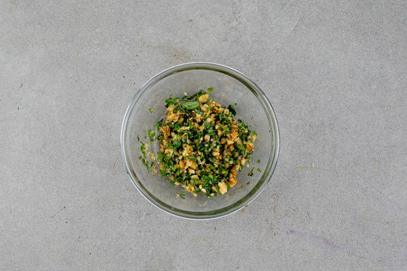 Die 1/2 der Walnüsse fein hacken und mit ca. 2/3 der Basilikumblätter, 1EL Olivenöl, 1/2TL Salz sowie Pfeffer nach Geschmack vermengen. Tipp: Die restlichen Walnüsse beim nächsten Nachmittagstief snacken!