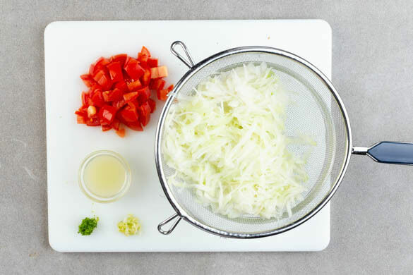 Den Kohlrabi jeweils schälen, grob raspeln und mit ½TL Salz vermengen. In ein Sieb geben und zum Abtropfen beiseitestellen. Die Tomaten grob würfeln. Die Limettenschalen abreiben, dann die Limetten halbieren und auspressen. Den Knoblauch schälen und fein reiben.