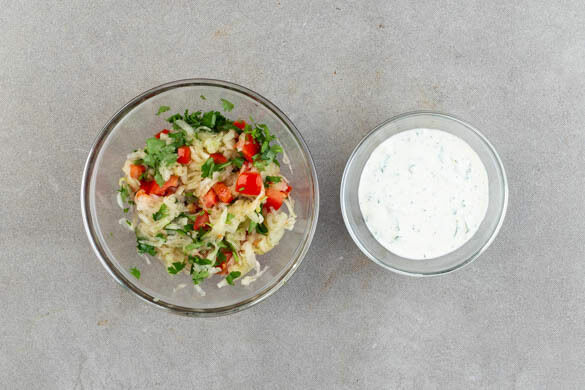 Den Koriander samt Stängeln fein schneiden. Die ½ des Korianders mit 4EL Mayonnaise und 2–3TL Wasser verrühren. Ggf. löffelweise Wasser zugeben, bis eine dickflüssige Konsistenz erreicht ist. Den Dip mit Salz und Pfeffer abschmecken. Den restlichen Koriander unter den Kohlrabisalat heben.