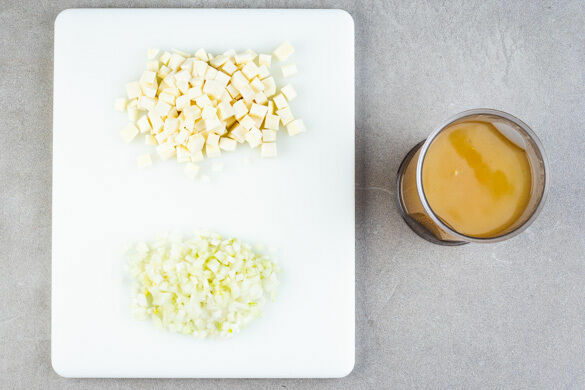 Die Pastinake schälen und in 1–2cm große Würfel schneiden. Die Zwiebel schälen, halbieren und fein würfeln. Das Brühgewürz in 1L heißem Wasser auflösen.