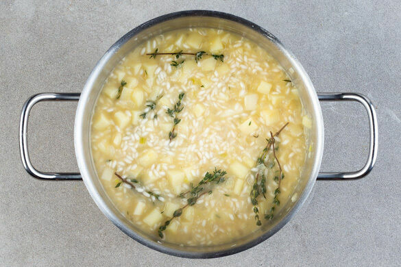Die Pastinaken, die Zwiebeln und den Reis in einem mittelgroßen Topf mit 1EL Olivenöl oder Butter bei mittlerer Hitze ca. 2Min. anbraten. Den Thymian und ca. ⅓ der Brühe hinzugeben. Stetig rühren, bis der Reis die Flüssigkeit aufgenommen hat. Nach und nach mehr Brühe angießen und einköcheln lassen, bis die gesamte Brühe aufgebraucht ist, das dauert ca. 22Min.