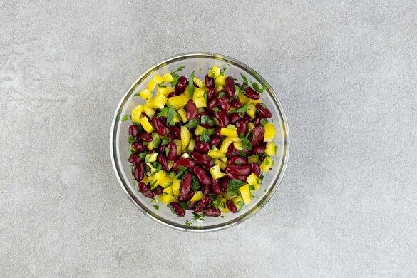 Die Bohnen in einem Sieb mit kaltem Wasser abspülen und abtropfen lassen. Die Paprika vierteln, entkernen und in kleine Würfel schneiden. Die Petersilie bis auf 2EL mit 2EL Olivenöl, 2–3EL Essig sowie je 1 kräftigen Prise Salz und Pfeffer zu einem Dressing verrühren. Die Bohnen und die Paprika mit dem Dressing vermengen und bis zum Servieren ziehen lassen.