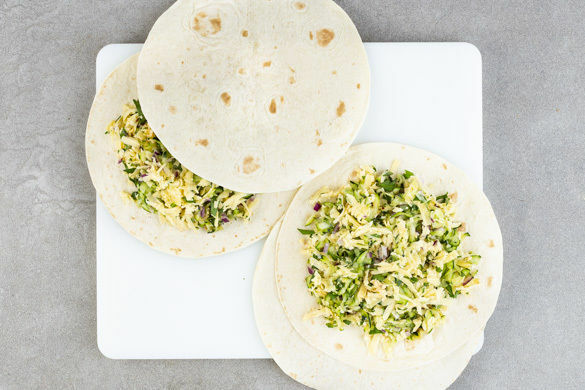 Die Zucchini mit den restlichen Zwiebeln, der restlichen Petersilie und dem Käse vermengen. Mit je 1 kräftigen Prise Salz und Pfeffer würzen. 4 Tortillas auslegen und die Zucchini-Käse-Mischung gleichmäßig darauf verteilen, dabei rundum einen ca. 2cm breiten Rand frei lassen. Mit jeweils 1 Tortilla bedecken. Zwei große Pfannen auf mittlerer Stufe erhitzen.