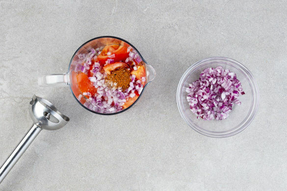 Die Tomaten vierteln. Die Zwiebel schälen, halbieren und in feine Würfel schneiden. Die ½ der Zwiebeln mit den Tomaten, 3EL Olivenöl und 1TL Salz in einem hohen Gefäß mit einem Stabmixer fein pürieren. Mit der Gewürzmischung abschmecken und die Salsa bis zum Servieren kalt stellen.