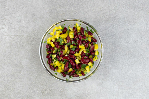 Die fertigen Quesadillas mit einem scharfen Messer in Viertel schneiden, mit dem Bohnensalat und der Salsa anrichten und servieren. Tipp: Sollte Füllung übrig bleiben, kann diese zum Frühstück mit 2–3 Eiern verquirlt als leckeres Omelett zubereitet werden.