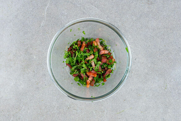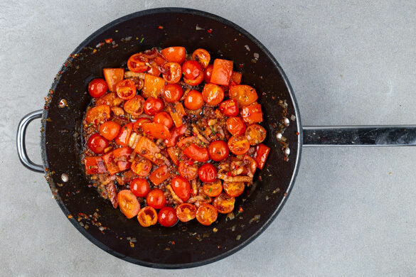 Die Paprika, die Schalotten, Peperoni nach Geschmack und die Petersilienstängel in der Pfanne mit 1EL Olivenöl bei mittlerer Hitze ca. 1min. anbraten. Dann den restlichen Speck, die Kirschtomaten, den Knoblauch und ca. ⅔ der Petersilienblätter mit einem Schuss Kochwasser hinzugeben und 4–5Min. garen, bis das Gemüse gar ist.
