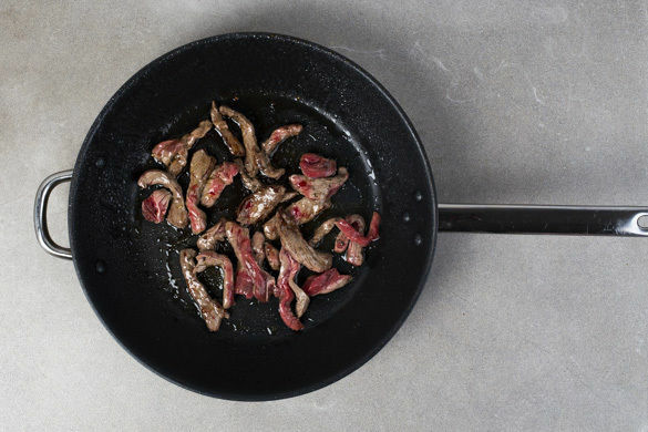 Das Fleisch in einer großen Pfanne bei starker Hitze 2–3Min. rundum scharf anbraten. Mit je 1 kräftigen Prise Salz und Pfeffer würzen, auf einem Teller beiseitestellen und abgedeckt warm halten.