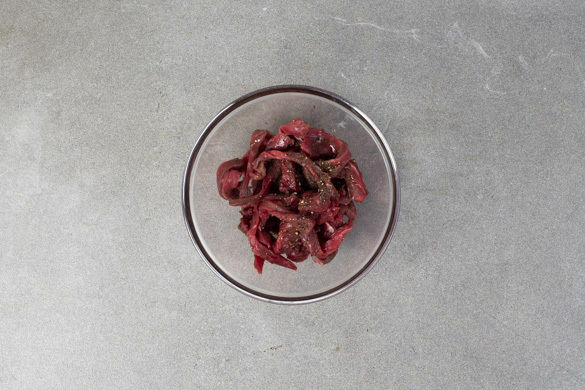Das Fleisch in einer großen Pfanne bei starker Hitze 2–3Min. rundum scharf anbraten. Mit je 1 kräftigen Prise Salz und Pfeffer würzen, auf einem Teller beiseitestellen und abgedeckt warm halten.