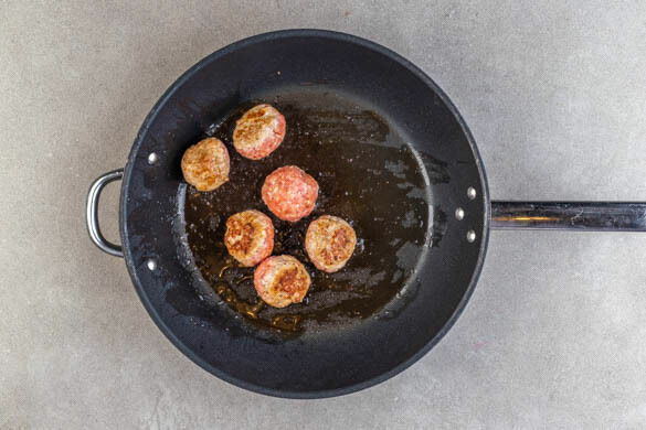 Die Hackbällchen in einer großen Pfanne mit 2TL Pflanzenöl bei mittlerer Hitze auf jeder Seite 2–3Min. anbraten. Dann weitere 3–4Min. abgedeckt weiterbraten, bis die Hackbällchen durch sind.