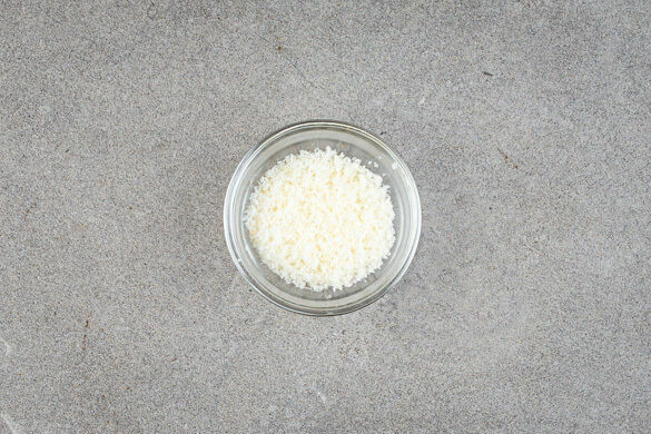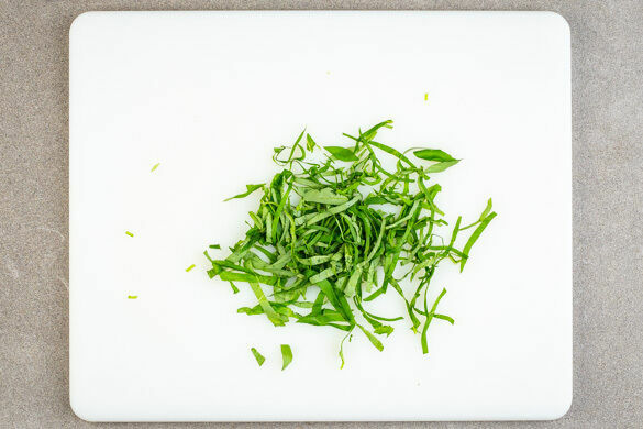 In einem mittelgroßen Topf ausreichend gesalzenes Wasser für die Pasta zum Kochen bringen. Die Basilikumblätter von den Stängeln zupfen und grob schneiden.