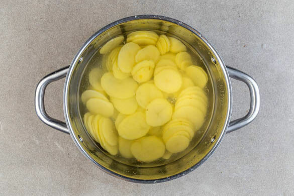 Den Backofen auf 220°C (200°C Umluft) vorheizen. In einem mittelgroßen Topf ausreichend leicht gesalzenes Wasser mit der ½ des Brühgewürzes für die Kartoffeln zum Kochen bringen. Die Kartoffeln schälen, in dünne Scheiben schneiden und 4–6Min. kochen, bis sie leicht weich, aber nicht ganz gar sind.