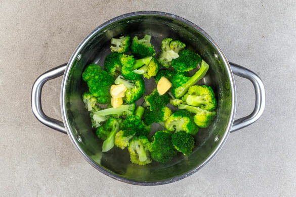In dem Topf ausreichend leicht gesalzenes Wasser mit dem restlichen Brühgewürz für den Brokkoli zum Kochen bringen. Den Brokkoli in mundgerechte Röschen schneiden. 5Min. vor Ende der Backzeit den Brokkoli in die kochende Brühe geben und in 3–4Min. bissfest garen.