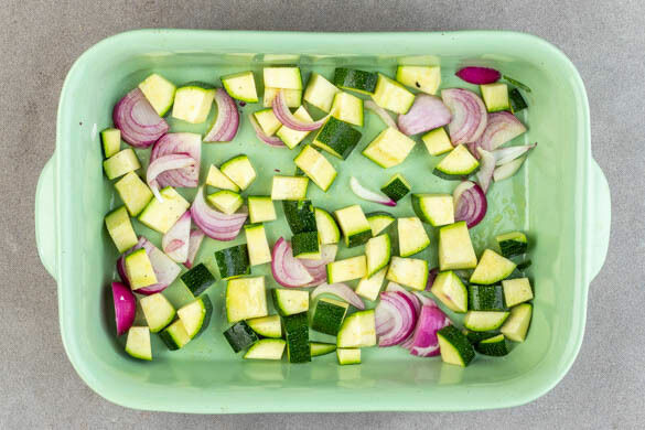 Den Backofen auf 240°C (220°C Umluft) vorheizen. Die Zwiebeln schälen, halbieren und in feine Streifen schneiden. Die Zucchini längs vierteln und in ca. 2cm große Würfel schneiden. Die Zwiebeln und die Zucchini in eine Auflaufform geben, mit 2EL Olivenöl und je 2 kräftigen Prisen Salz und Pfeffer vermengen und mindestens 8Min. oder bis Schritt 4 rösten.