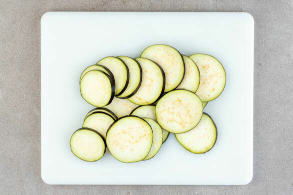 Die Auberginen in ca. 0,5cm dünne Scheiben schneiden.