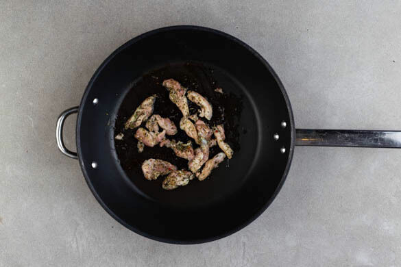 Das Fleisch in einer großen Pfanne mit 1EL Olivenöl bei mittlerer Hitze 3–5Min. gar und goldbraun braten, dabei gelegentlich umrühren.