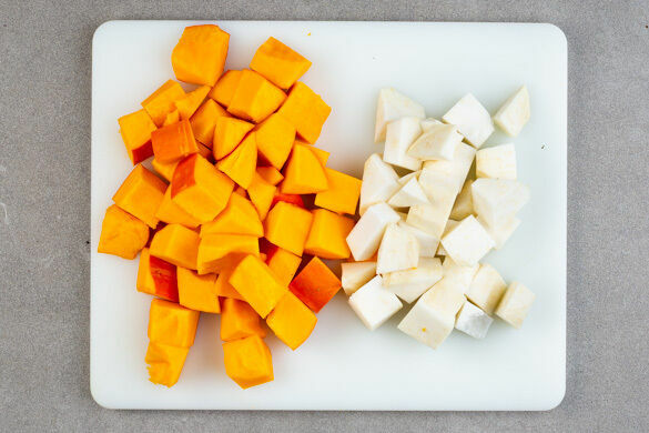 Den Backofen auf 240°C (220°C Umluft) vorheizen. Die Kürbisse halbieren, entkernen und in ca. 2cm große Stücke schneiden. Den Sellerie vierteln, schälen und ebenfalls in ca. 2cm große Stücke schneiden.