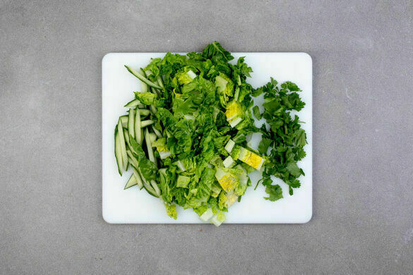 Den Salat längs halbieren und in breite Streifen schneiden, dabei den Strunk entfernen. Die Gurken längs vierteln und in ca. 0,5cm dünne Streifen schneiden. Den Koriander samt Stängeln grob schneiden.