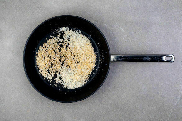Die Kokosraspel in einer kleinen Pfanne ohne Zugabe von Fett 1–2Min. leicht braun anrösten. Vorsicht, sie können schnell verbrennen. Zum Abkühlen aus der Pfanne nehmen.