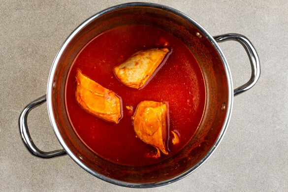Das Fleisch trocken tupfen, in 2–3 gleich große Stücke schneiden und in dem Sud bei starker Hitze in 13–15Min. gar kochen. Tipp: Das Fleisch muss nicht vollständig von dem Sud bedeckt sein, es sollte aber regelmäßig gewendet werden.