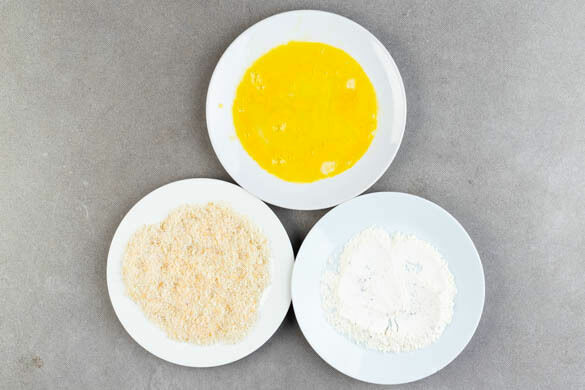 Das Fleisch inzwischen trocken tupfen und großzügig mit Salz und Pfeffer würzen. 2EL Mehl auf einen Teller geben und mit je 1 kräftigen Prise Salz und Pfeffer vermengen. 1 Ei in einem tiefen Teller verquirlen, dann 1 Prise Salz unterrühren. Das Panko-Paniermehl auf einen dritten Teller geben.