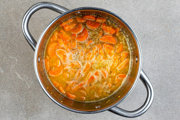Den Backofen auf 220°C (200°C Umluft) vorheizen. Die Karotten ggf. schälen, längs halbieren und in dünne Scheiben schneiden. Die Fenchelsamen mit 2EL Butter und 1EL Olivenöl in einem großen Topf bei mittlerer Hitze 1–2Min. unter stetigem Rühren anrösten, bis die Butter geschmolzen ist und die Fenchelsamen goldbraun sind.
