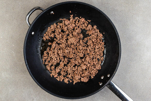 Das Hackfleisch in einer großen Pfanne mit 2EL Olivenöl bei mittlerer Hitze in 3–4Min. krümelig anbraten.