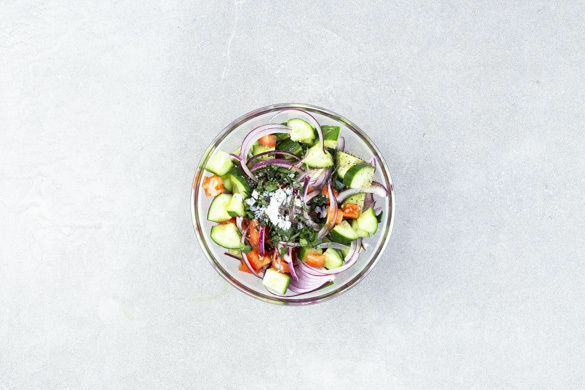 Die Tomaten in kleine Würfel schneiden. Die Gurke längs vierteln und ebenfalls in kleine Würfel schneiden. Mit der Petersilie, den restlichen Zwiebeln und 1EL Olivenöl vermengen. Den Salat mit der restlichen Zitronenschale, dem restlichen Zitronensaft und Salz und Pfeffer nach Geschmack würzen. Die Köfte mit dem Hummus und dem Salat anrichten und servieren.