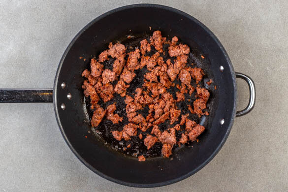 Das vegane Hack in einer mittelgroßen Pfanne mit 1EL Olivenöl bei mittlerer Hitze in 3–4Min. krümelig anbraten.