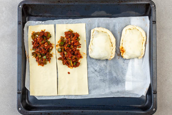 Den Teig mit dem Papier nach unten auf einem Backblech ausrollen und in 4 Rechtecke schneiden. Die Füllung auf je eine Hälfte eines Rechtecks verteilen, dann die andere Hälfte darüberklappen. Die Ränder mit einer Gabel oder den Fingern verschließen und die Empanadas im Ofen in 20–25Min. goldgelb backen.