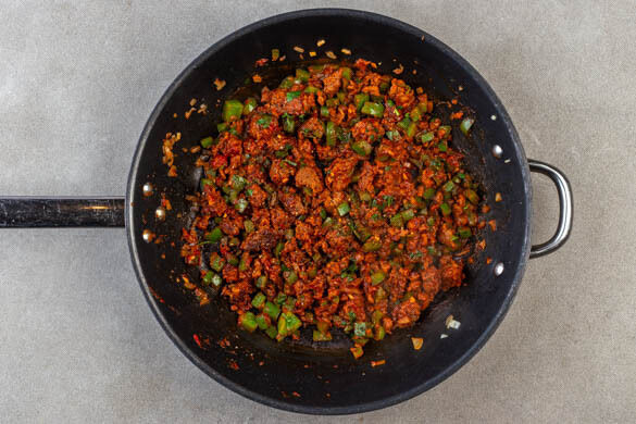 Die Zwiebeln, den Knoblauch und die Paprika zum Hack in die Pfanne geben und 2–3Min. mitbraten. Das Paprikapulver nach Geschmack und das Tomatenmark unterrühren, mit 80ml Wasser ablöschen und alles 2–3Min. sanft einköcheln lassen. Anschließend ca. ⅓ der Petersilie unterrühren. Mit Salz und Pfeffer abschmecken.