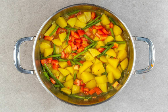 Die Bohnen und die Kartoffeln hinzufügen und mit 750ml heißem Wasser ablöschen. Ggf. etwas mehr Wasser hinzufügen, damit das Gemüse vollständig bedeckt ist. Das Brühgewürz einrühren und Suppe abgedeckt zum Kochen bringen. Sobald die Suppe kocht, die Hitze reduzieren und die Suppe ca. 12Min. sanft köcheln lassen, bis die Kartoffeln fast gar sind.