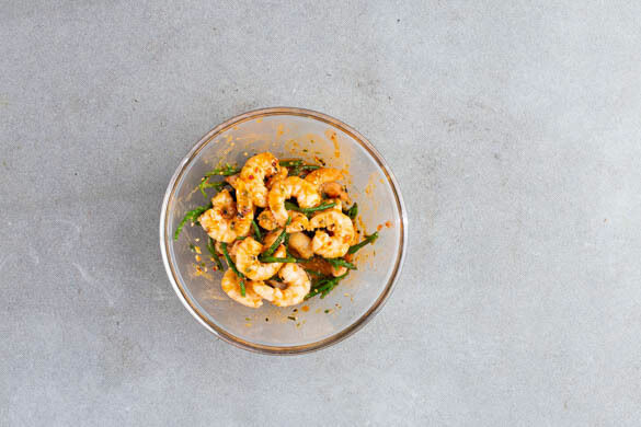 Die Garnelen und den Queller aus der Pfanne nehmen und mit der Gewürzmischung vermengen. Die Pfanne nicht auswischen.