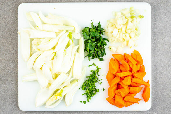 Den Fenchel halbieren und in ca. 1cm breite Streifen schneiden, dabei den Strunk und die Stängel entfernen. Die Karotten ggf. schälen, längs halbieren und schräg in ca. 1cm breite Scheiben schneiden. Die Zwiebel schälen, halbieren und grob würfeln. Die Petersilienstängel und -blätter separat grob hacken.