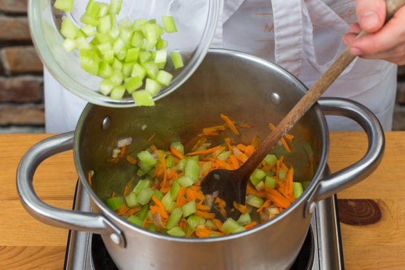 Die Karotten, den Sellerie und die Schalotten in einem großen Topf mit 1–2EL Olivenöl bei starker Hitze 3–4Min. anschwitzen. Die Kapern in einem Sieb abspülen und abtropfen lassen.