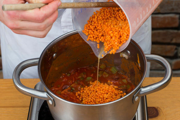 Die Kapern mit dem Oregano, den Oliven und den passierten Tomaten unterrühren, dann die Linsen mit dem Wasser zugeben und nach Bedarf mit 120–150ml Wasser ablöschen. Die Linsen-Bolognese bei mittlerer Hitze 15–20Min. köcheln lassen, bis die Linsen bissfest sind. Mit Essig und Chili nach Geschmack verfeinern und mit Salz und Pfeffer abschmecken.
