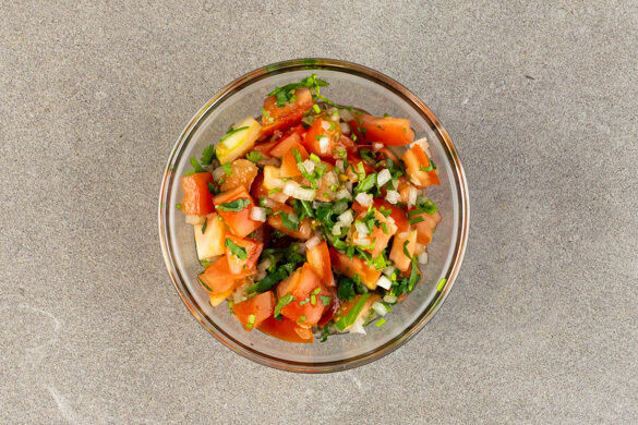 1TL der Chiliflocken mit 6EL heißem Wasser verrühren und beiseitestellen. Die Tomaten in kleine Würfel schneiden. Den Koriander samt Stängeln grob schneiden und mit den Tomaten, den gewürfelten Zwiebeln, 2–3EL Limettensaft und je 1/2TL Salz und Pfeffer zu einer Salsa vermengen.