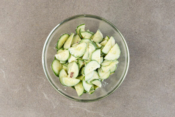 Die Gurken längs halbieren und in dünne Scheiben schneiden. Die Chiliflocken in ein feinmaschiges Sieb abgießen und mit 2–3EL Limettensaft, 4EL Mayonnaise und je 1/2TL Salz und Pfeffer zu einem Dressing verrühren. Die Gurken mit dem Dressing vermengen.