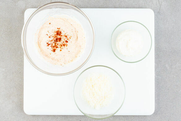 Den Käse fein reiben. Die Crème fraîche mit ca. ⅔ des Käses verrühren und mit 1 Prise Salz und Pfeffer würzen. 2–3EL Käsecreme für die Garnitur beiseitestellen. Die restliche Käsecreme mit der ½ der Gewürzmischung verfeinern.